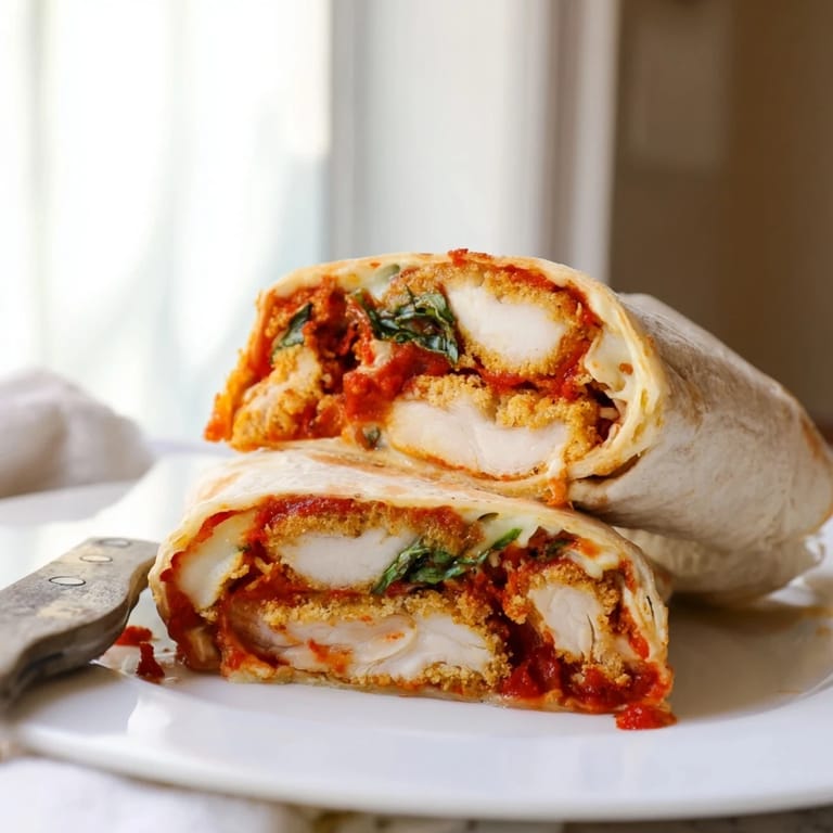 Save on Pinterest My skillet was smoking, the chicken was golden, and I had ten minutes before everyone got home. I sliced into one cutlet and it was perfect: crispy outside, juicy inside. Then I realized I had no pasta cooked. I grabbed tortillas from the pantry, smeared marinara right down the center, tucked in that beautiful chicken, and rolled it tight. Best panic decision I ever made.