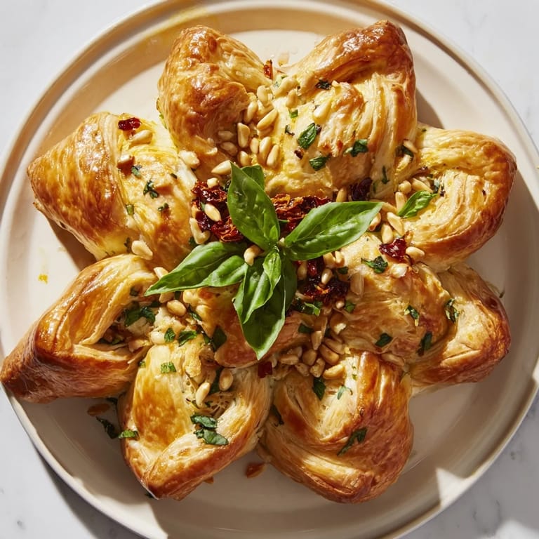 Save on Pinterest A festive and elegant savory pastry shaped like a poinsettia, filled with herbed cream cheese and sun-dried tomatoes—perfect for holiday entertaining.